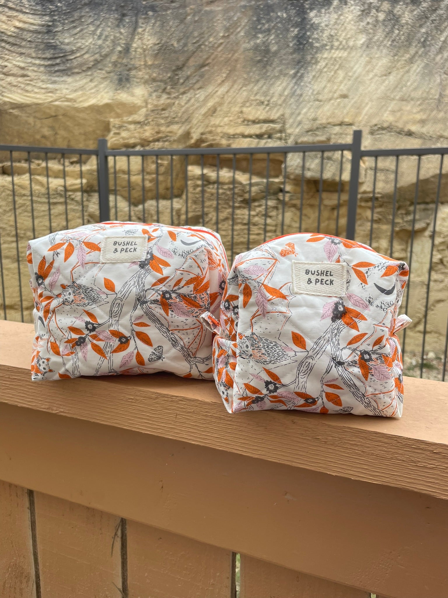 Keep your essentials organized in style with this playful quilted cotton makeup bag. Featuring a charming orange and white bat pattern, it's the perfect accessory for anyone who loves a little spooky-season spirit year-round. The sturdy quilted construction keeps your cosmetics, brushes, and small items secure, while the boxy shape maximizes storage space. Whether you're getting ready for a night out or packing for travel, this whimsical bag adds a fun pop of personality to your routine.