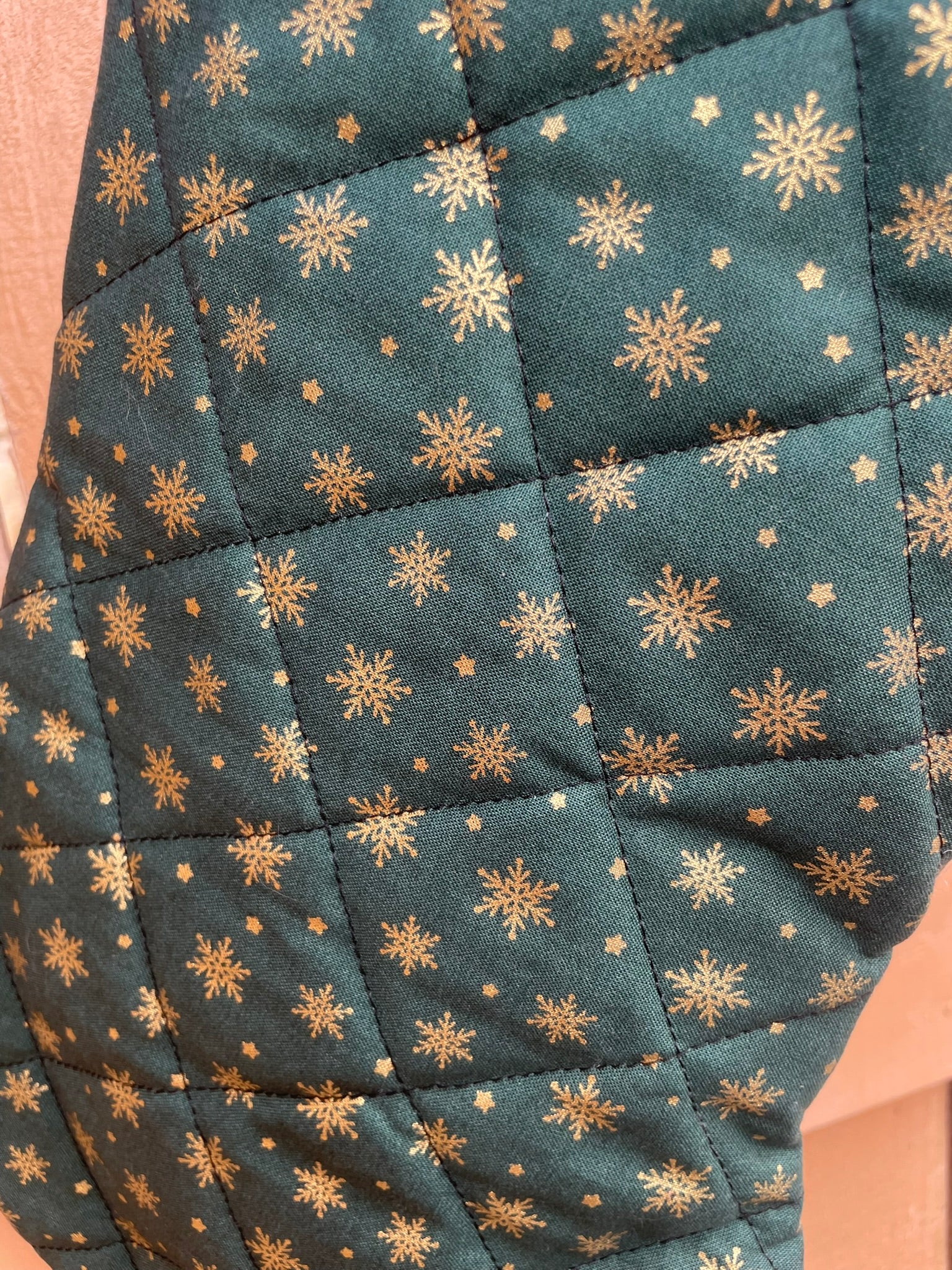 This festive quilted stocking brings holiday charm to your mantelpiece with its rich green fabric and elegant gold snow detailing. The generous large size accommodates generous gift-giving, while the quilted construction adds texture and durability. Perfect for creating a coordinated seasonal display or as a thoughtful gift for those who appreciate quality holiday décor. The classic color palette complements both traditional and contemporary holiday settings.