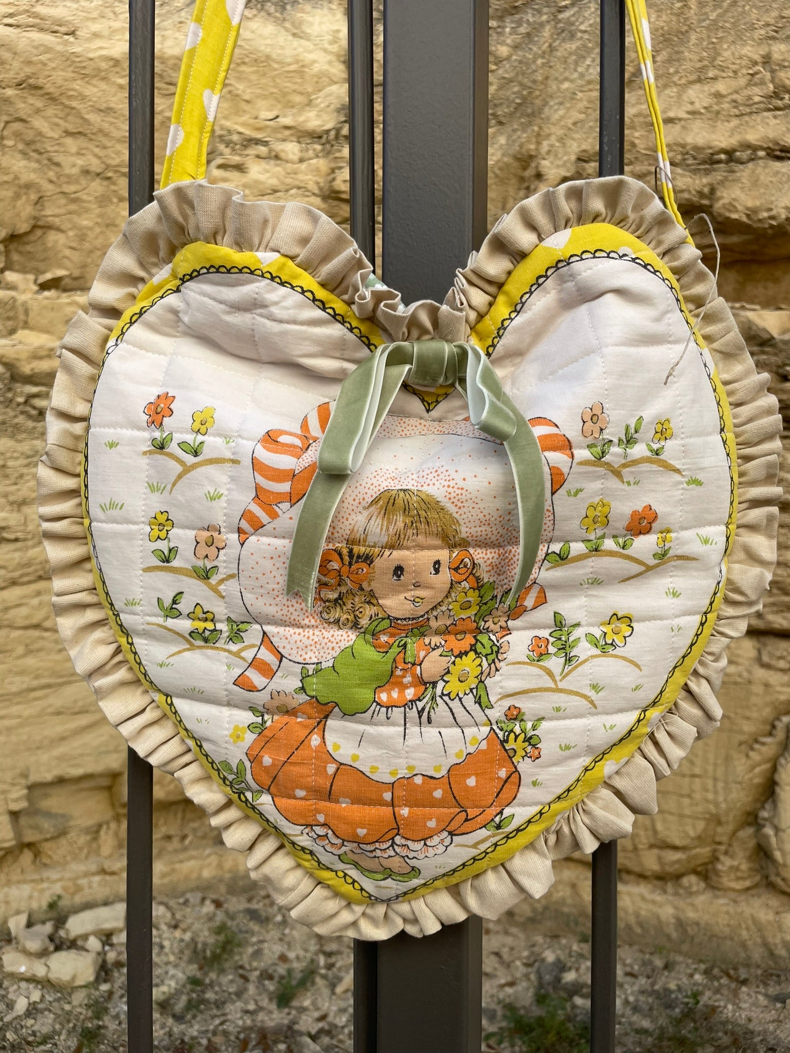 Crafted from carefully curated vintage fabrics, this charming tote features a distinctive ruffle heart detail that adds character and whimsy. The exterior showcases timeless patterns while the interior reveals a delightful floral lining, creating a piece that's as beautiful inside as it is out. Perfect for everyday carry or as a thoughtful gift, this tote combines nostalgic appeal with practical functionality.